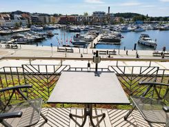 Vom Balkon aus genießen Sie den herrlichen Ausblick auf den Hafen und auf die Müritz.