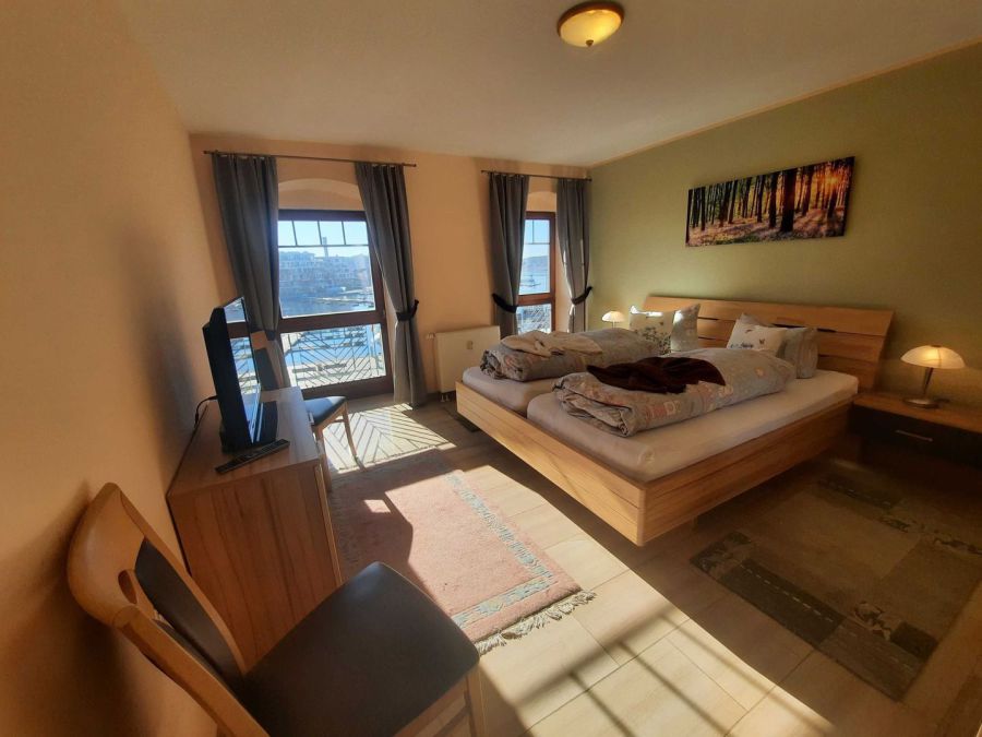 Im Schlafzimmer können Sie bereits aus dem komfortablen Doppelbett den Blick auf das Wasser und auf den wunderschönen Hafen genießen.